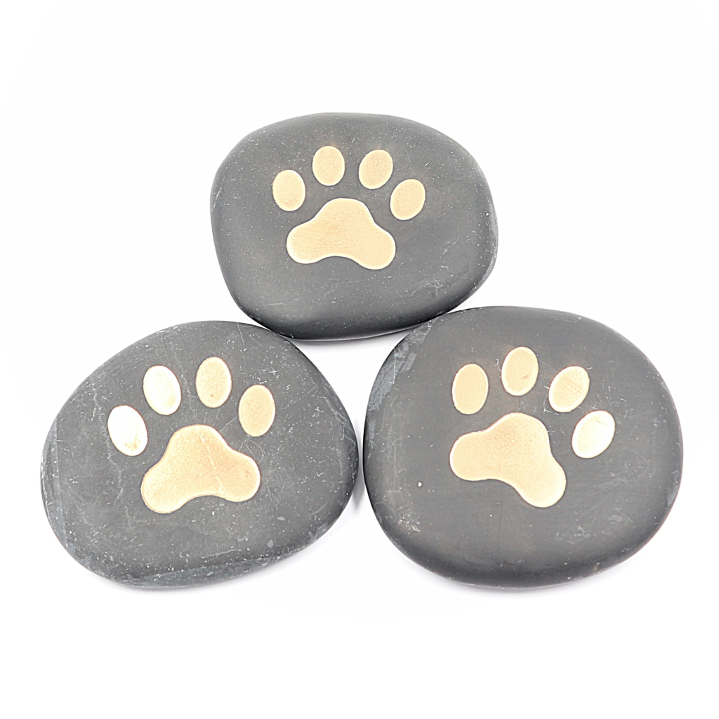 Mooie gedenksteen aan je trouwe viervoeter. Dit is een echte basaltsteen waarin een goudkleurig kattenpootje is gemaakt.