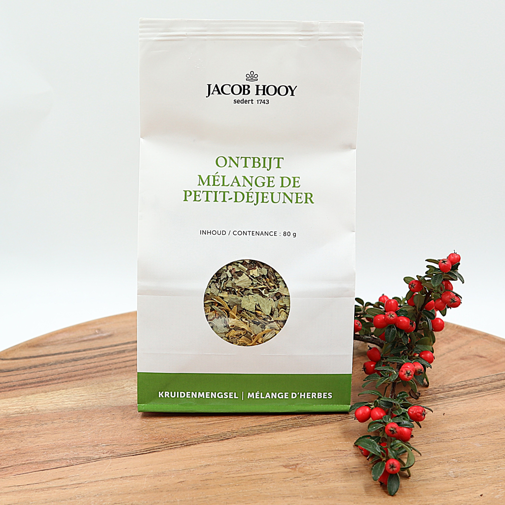 Ontbijtkruiden (Fragaria spp., pimpinella anisum, mentha crispa, cassia angustifolia, achillea millefolium, calendula officinalis.) van Jacob Hooy voor een verkwikkende start van een nieuwe dag.