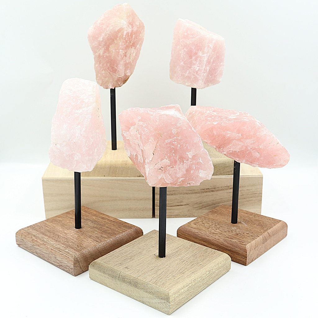 We hebben de mooiste ruwe Rozenkwarts uitgezocht, ingeboord en ze geplaats op Merantie houten blokje ( FSC ). Deze zijn onbehandeld en verschillen ook van kleur. De edelstenen zijn niet vastgelijmd.