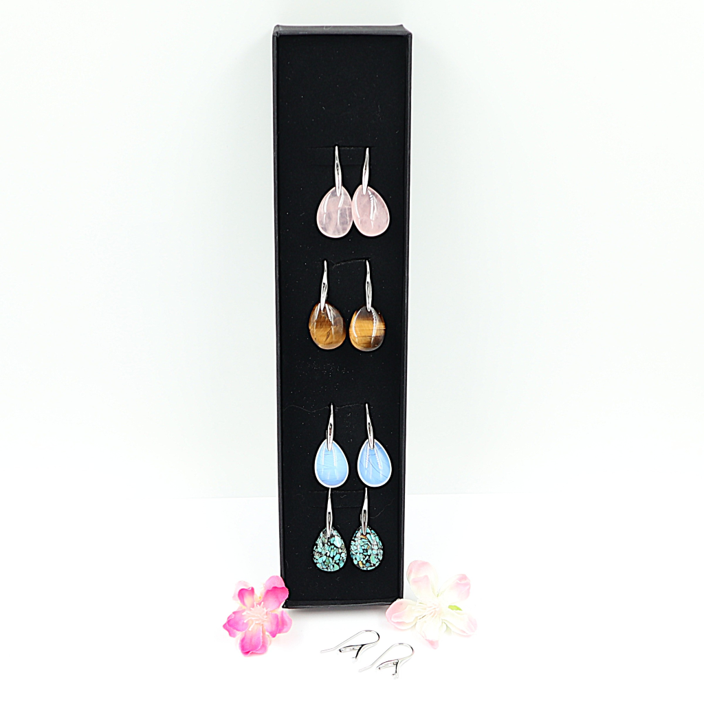 Kunt u geen keuze maken....neem dan deze geweldige set met 4 paar oorbellen. Rozenkwarts, Opaal glas (Opaliet), Tijgeroog en Turkoois.