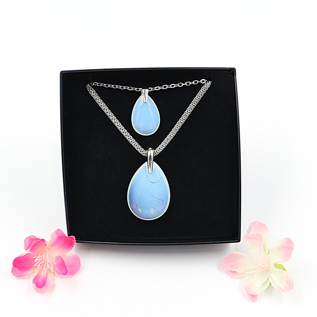 Prachtige set kettingen met een grote Opaal glas druppelhanger voor Moeder en een kleine Opaal glas druppelhanger voor je kind.