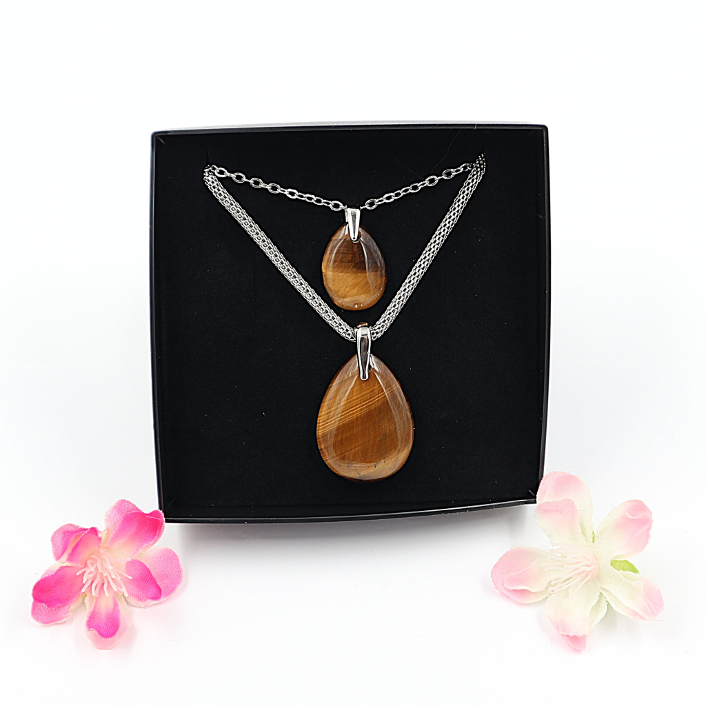Prachtige set kettingen met een grote Tijgeroog druppelhanger voor Moeder en een kleine Tijgeroog druppelhanger voor je kind.