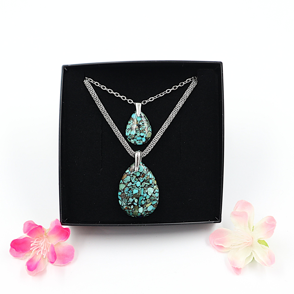 Prachtige set kettingen met een grote Turkoois druppelhanger voor Moeder en een kleine Turkoois druppelhanger voor je kind.