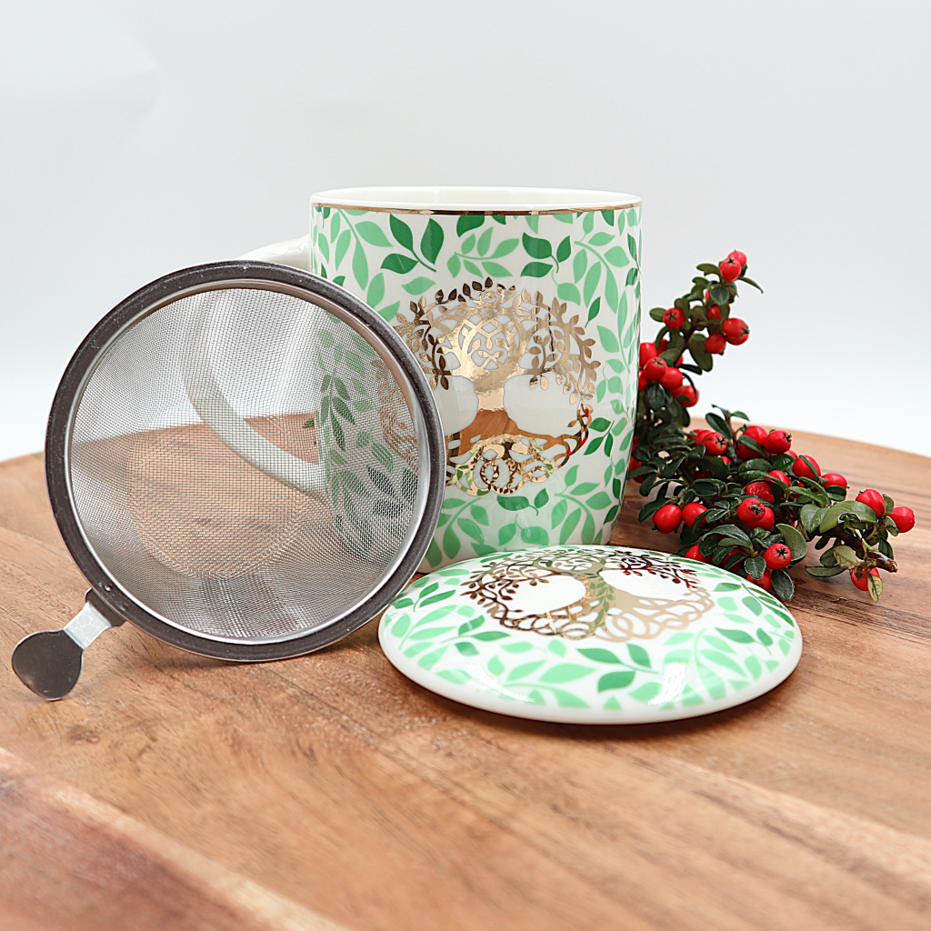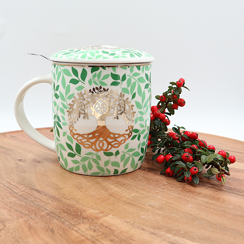 De boom des levens theemok met bijpassend deksel en roestvrijstalen theezeef.