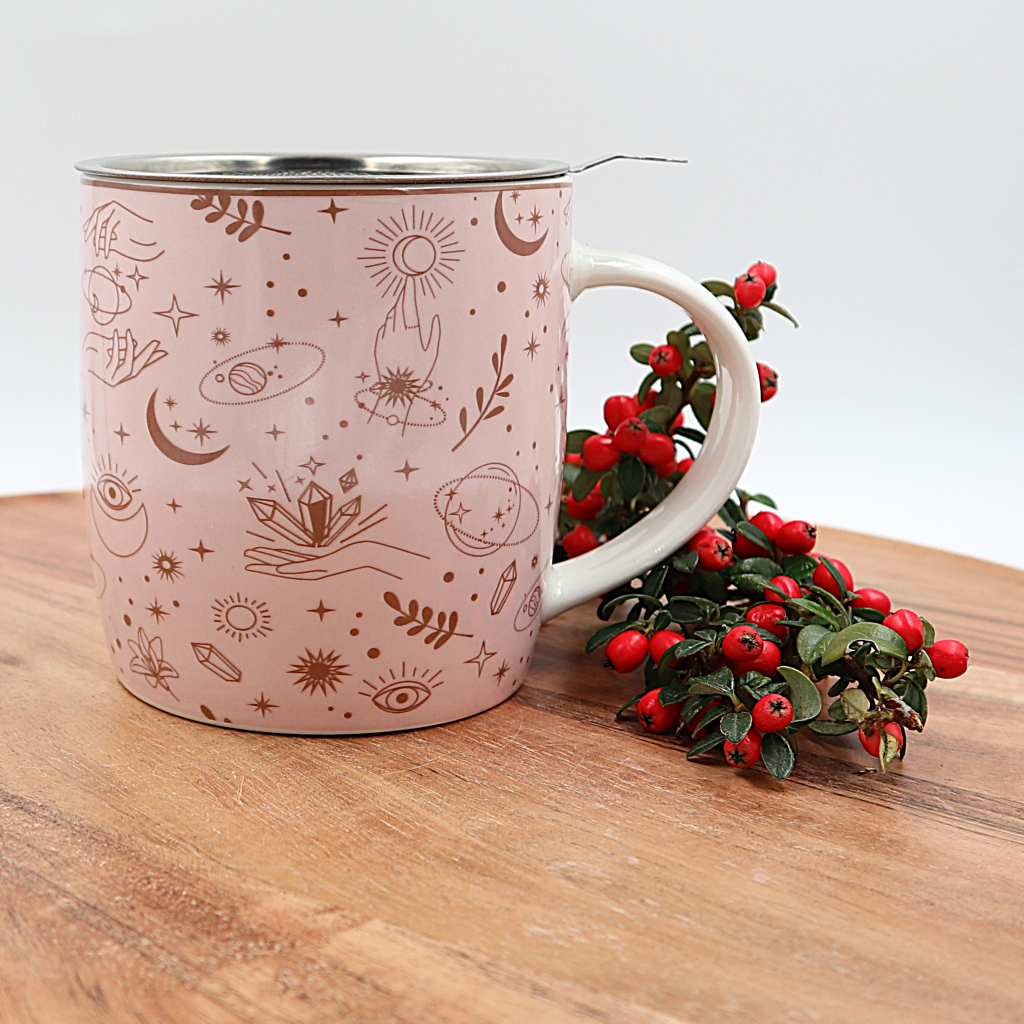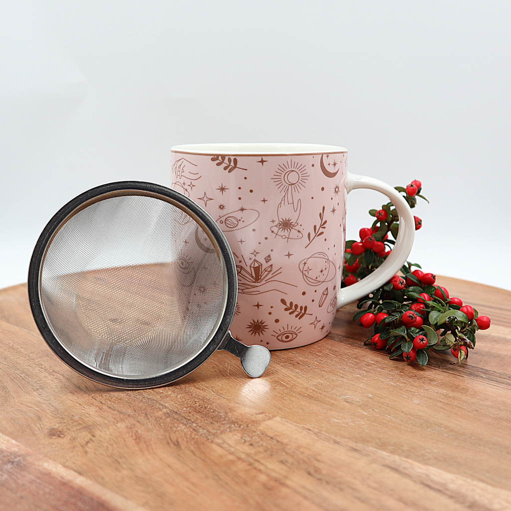 Mystieke symbolen theemok met roestvrijstalen theezeef.